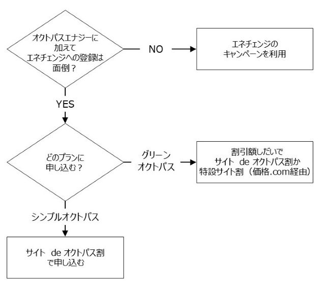 エネチェンジへのユーザー登録が面倒な人で、シンプルオクトパスを申し込む場合はサイト de オクトパス割。グリーンオクトパスを申し込む場合は、特設サイト割(価格.com経由)かサイト de オクトパス割が有利です。